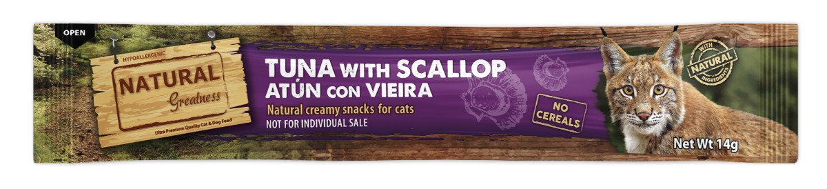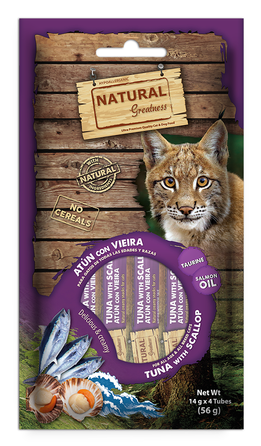 Atún* (26 %), Vieira* (4 %), Almidón de tapioca, Extracto de atún, Aceite de salmón (800 mg/kg). Ingredientes naturales*.