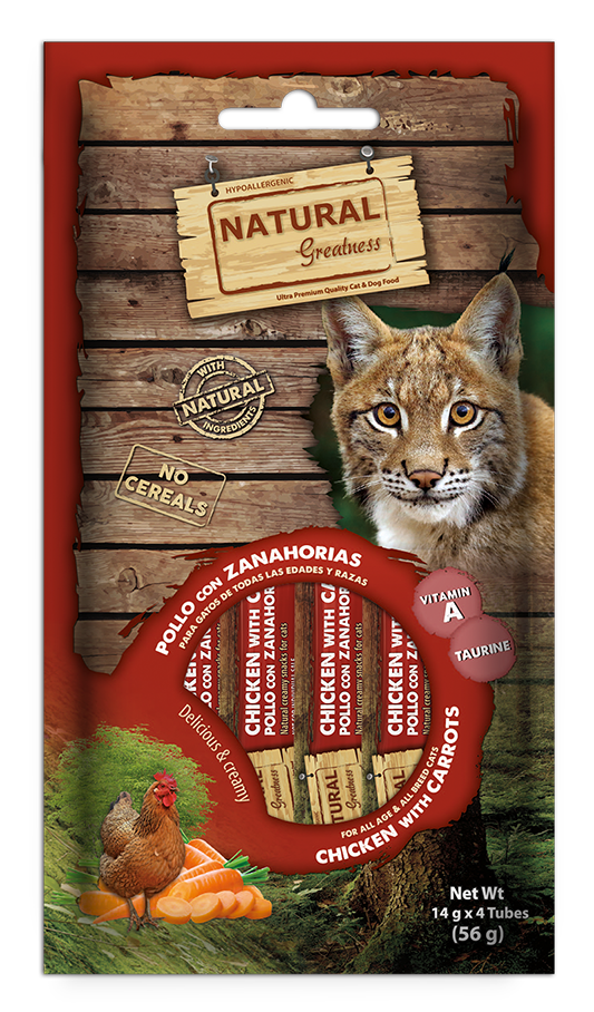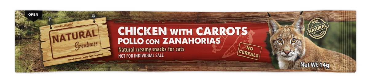Pollo* (26 %), Zanahoria* (4 %), Almidón de tapioca, Extracto de atún. Ingredientes naturales*.